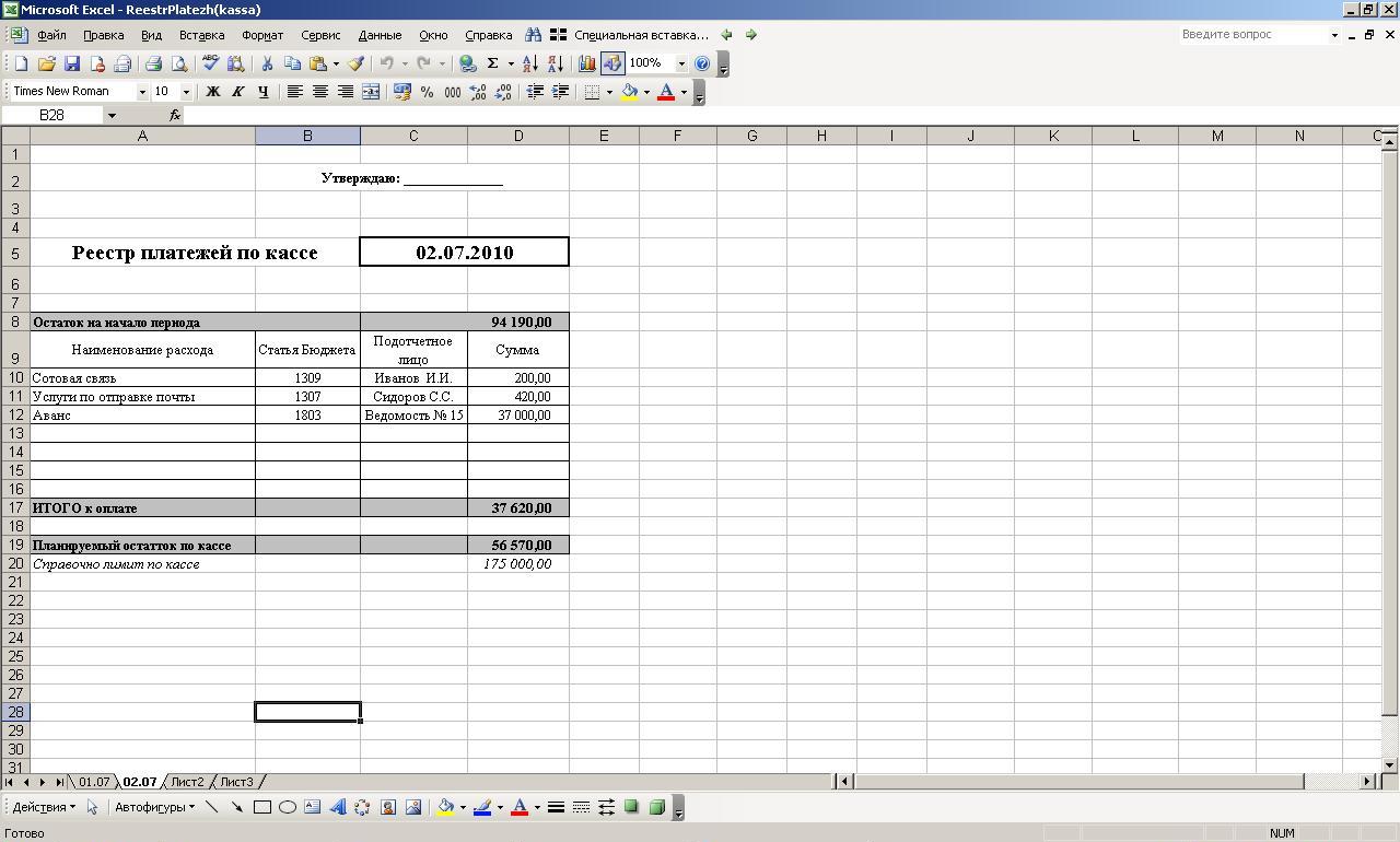 После заполнения всех полей рассчитывается сумма платежей за день и планируемый остаток. Очевидно, что планируемый остаток должен быть не отрицательным с одной стороны, и не превышать сумму лимита по кассе с другой стороны (сумма лимита по кассе для справки проставляется в конце реестра). Для удобства, реестр на каждый день лучше вести в одном файле на отдельных листах.